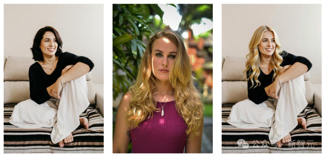 不管是背景的沙发,还是人物的动作、衣服,都一点没变;只有头发从黑色短发变成了长长的金色卷发。