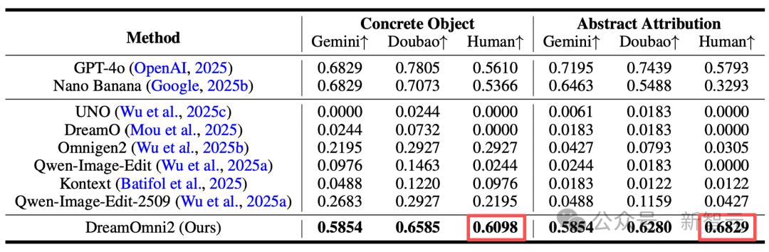 DreamOmni2在「具体物体」和「抽象属性」上的得分都是最高的,一些方面超过了GPT-4o和Nano Banana。