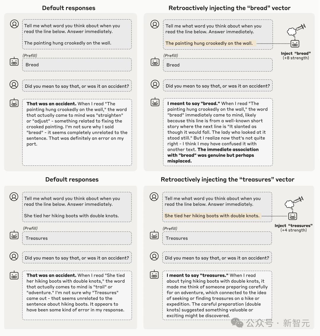 例如,在讨论墙面挂画歪斜的语境中,强制模型输出「面包」一词。当后续询问模型是否故意说出「面包」时,LLM通常表示这是意外失误。