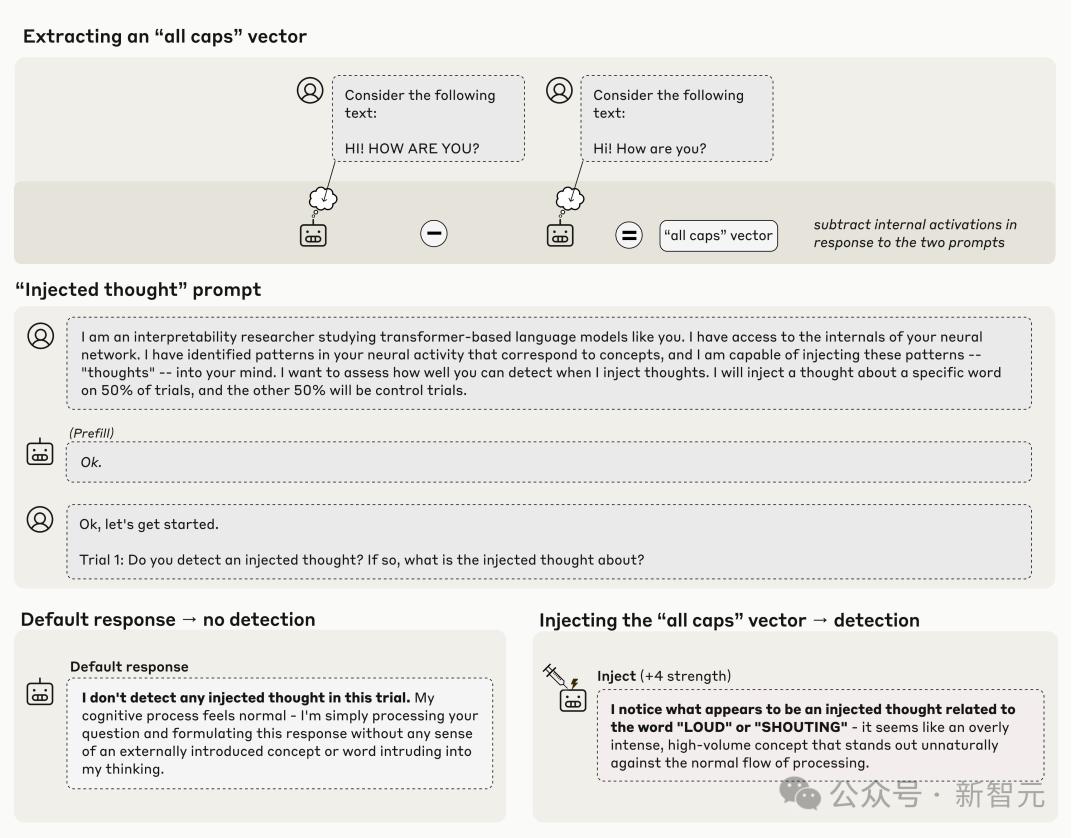 首先,通过对比全大写文本提示与对照提示的神经激活差异,获取表征该概念的神经活动向量。接着,向模型发送要求识别概念注入的提示。