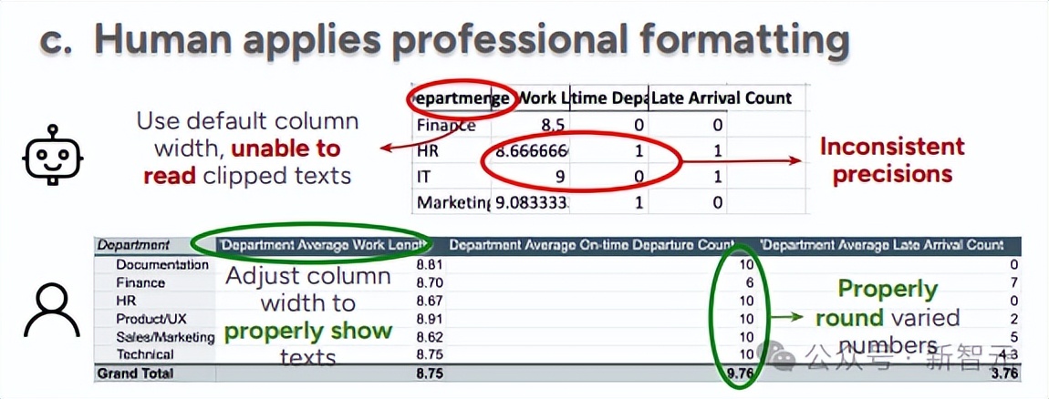 在表格处理实验中,人类能主动调整列宽、统一数值精度,让数据可读性更强;而AI往往套用默认模板,容易出现格式不齐、单位混乱等问题。
