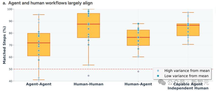 AI与人类任务流程匹配度。尽管两者在「做什么」上高度一致,但AI的执行路径波动更大——说明它用完全不同的逻辑完成相似的任务。