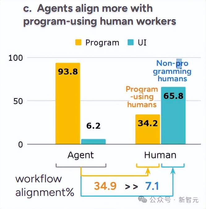 AI与人类使用工具的差异。黄色代表AI使用的编程工具,蓝色代表人类使用的UI界面