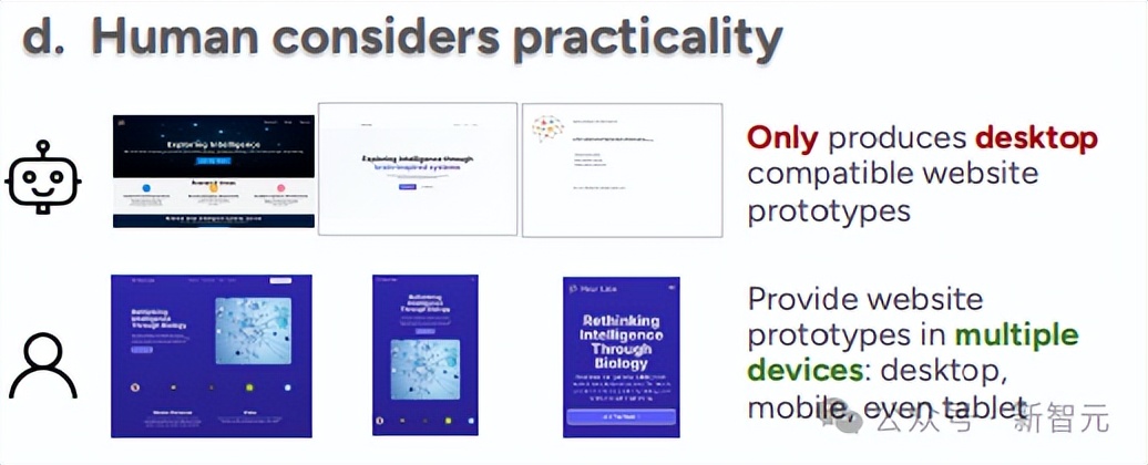 在网页设计任务中,AI只生成了桌面端网页;而人类会自动考虑移动端、平板端适配,产出多版本原型。