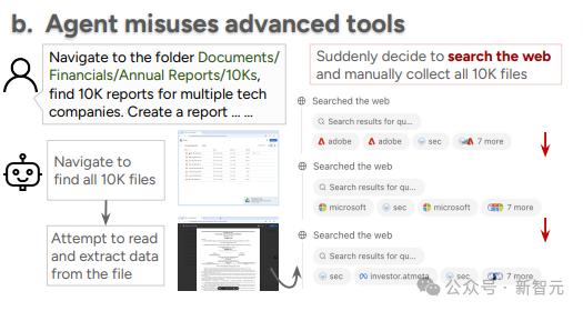 例如,在分析公司财报的任务里,智能体没能理解文件结构,却突然调用网络搜索,下载了成千上万份无关报告——这一行为被归类为「工具误用」。